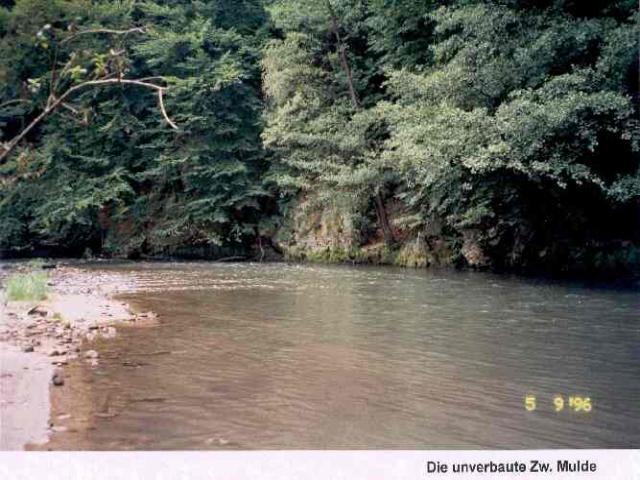 Unverbaute Flussabschnitte, ein Schauspiel der Natur. Hier einer der letzten naturnahen Abschnitte der Zwickauer Mulde im Erzgebirge. Leider gibt es diese Bilder nur noch selten, denn durch die Förderpolitik Sachses wurden 80 % der Flüsse im Erzbebirge schon zerstört. |