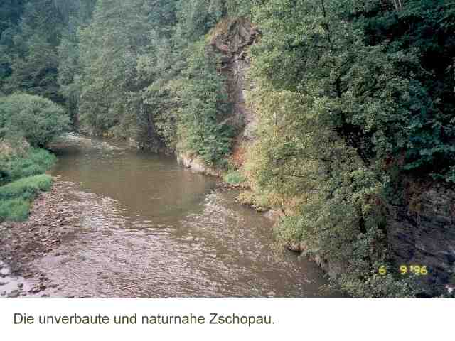 Unverbaute Flussabschnitte, ein Schauspiel der Natur. Hier einer der letzten naturnahen Abschnitte der Zschopau im Erzgebirge. Leider gibt es diese Bilder nur noch selten, denn durch die Förderpolitik Sachses wurden 80 % der Flüsse im Erzbebirge schon zerstört. |