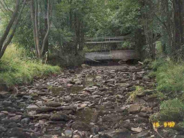 Trockene Ausleitungsstrecke an der WKA "Hohne"an der Pressnitz bei Streckenwalde. Durch den WKA-Betreiber wird der Fluss auf einer Länge von 800 Metern trockengelegt und damit als Gewässerbiotop vernichtet. |