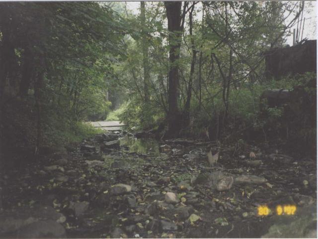 Trockene Ausleitungsstrecke am Pöhlbach bei Wiesenbach. Durch den WKA-Betreiber Herrn Brand wird der Fluss auf einer Länge von 800 Metern trockengelegt und damit als Gewässerbiotop vernichtet. |
