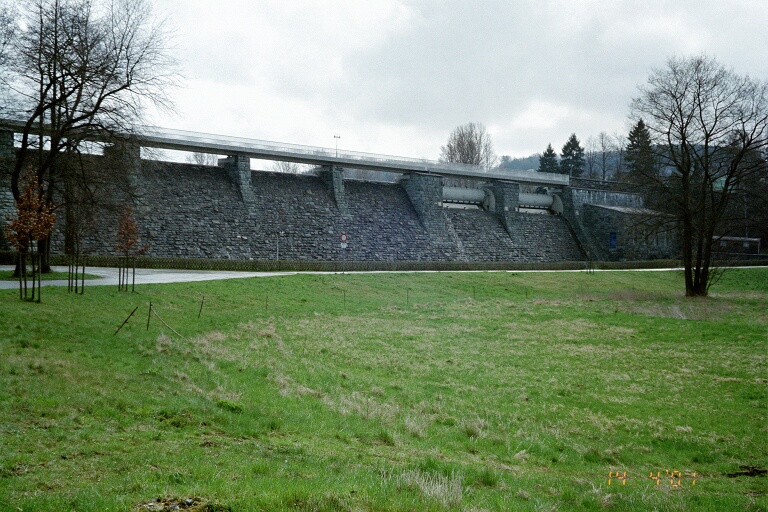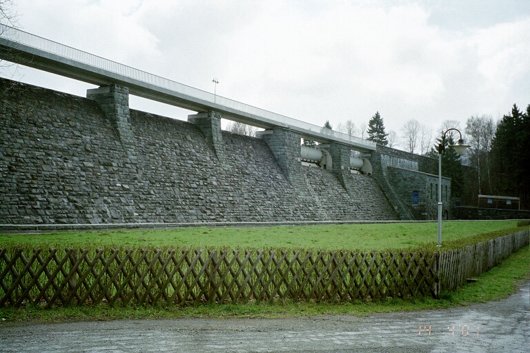 Sie die Mauer der Tal- sperre Pirk, eine wohl eindrucks-