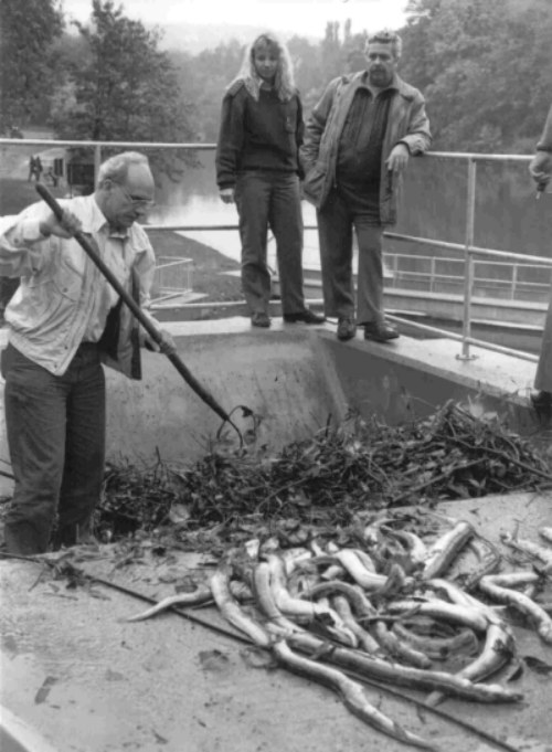 Ausgraben der getöteten Lahnaale aus dem Rechengutbehälter an der Wasserkraftanlage
